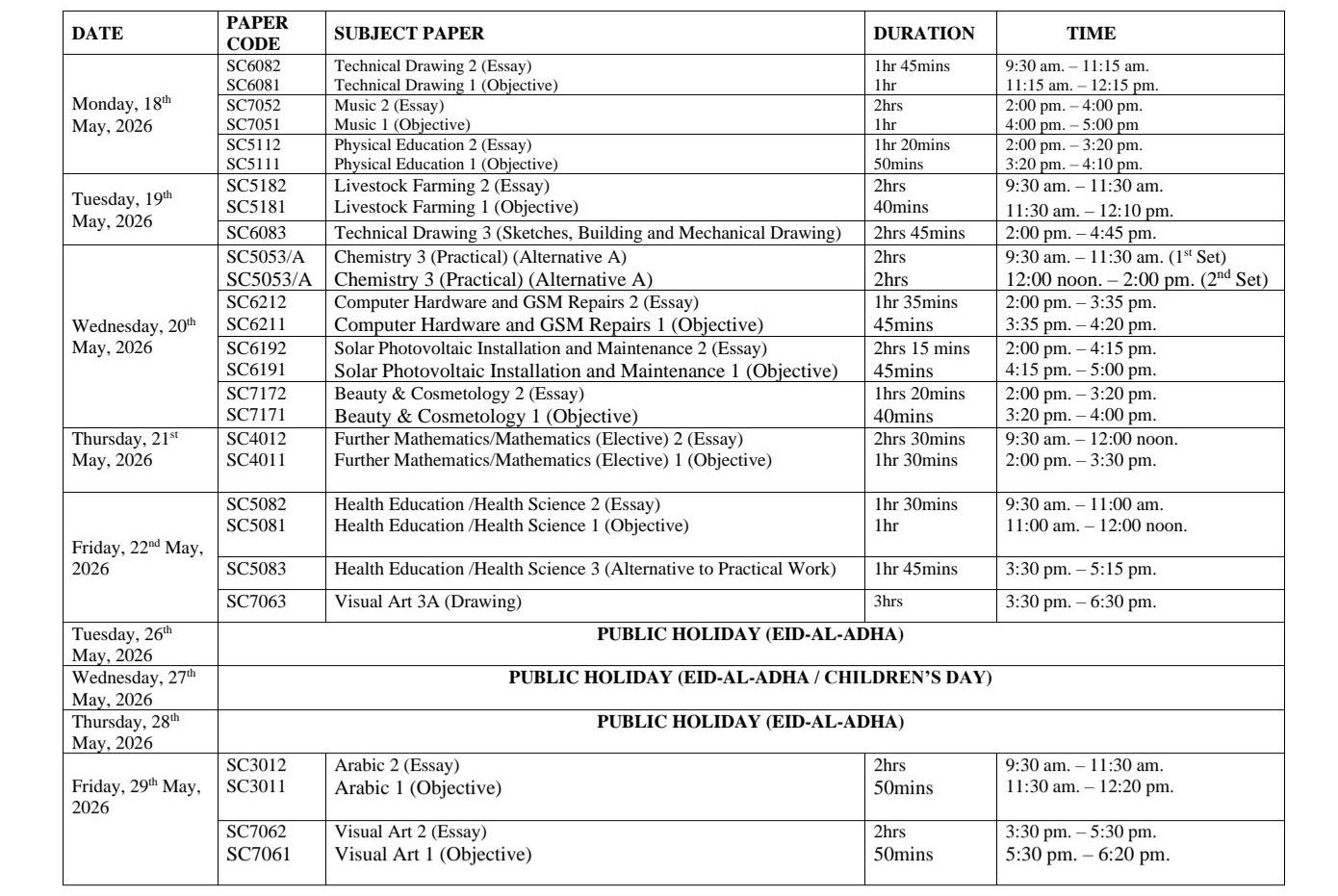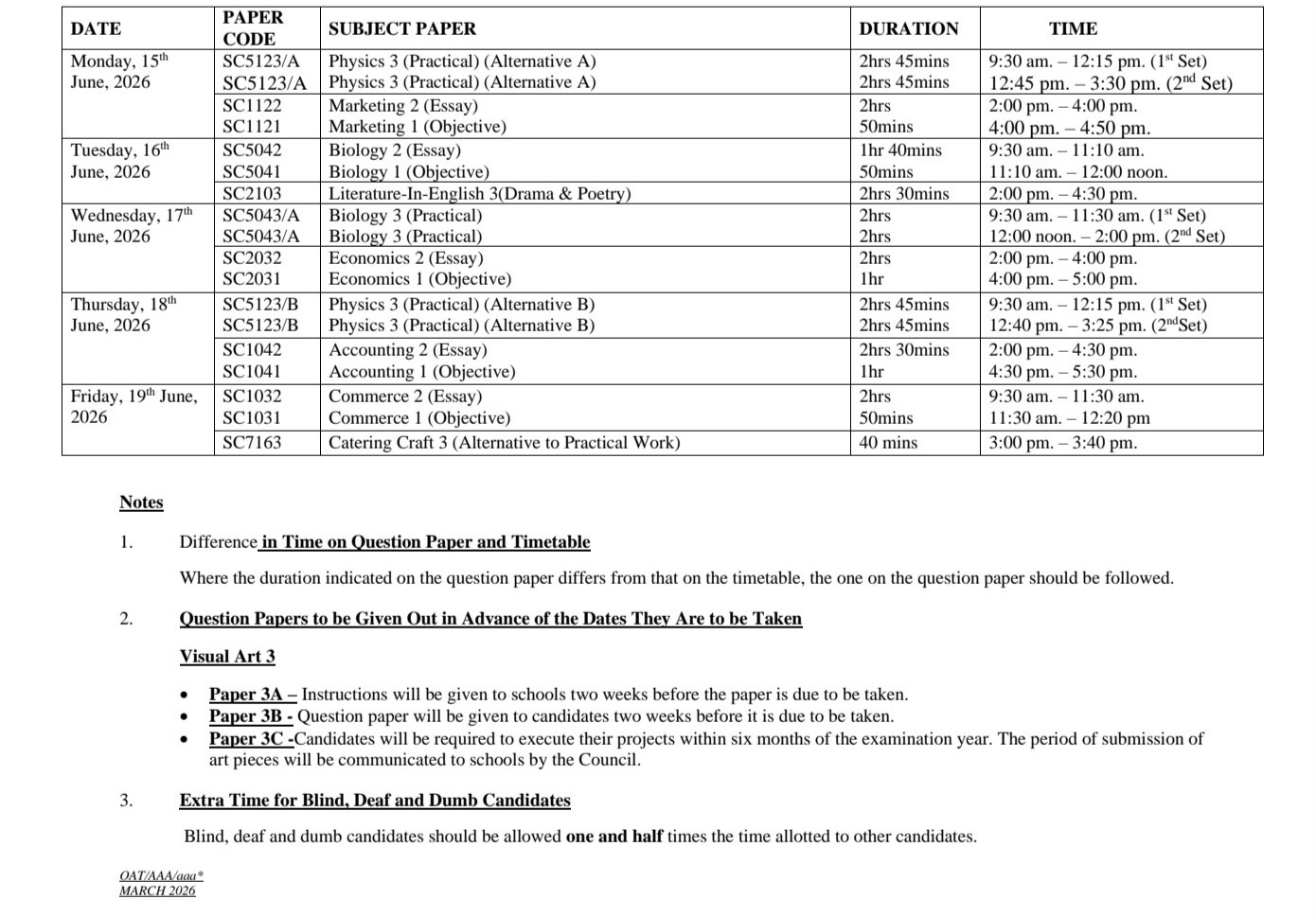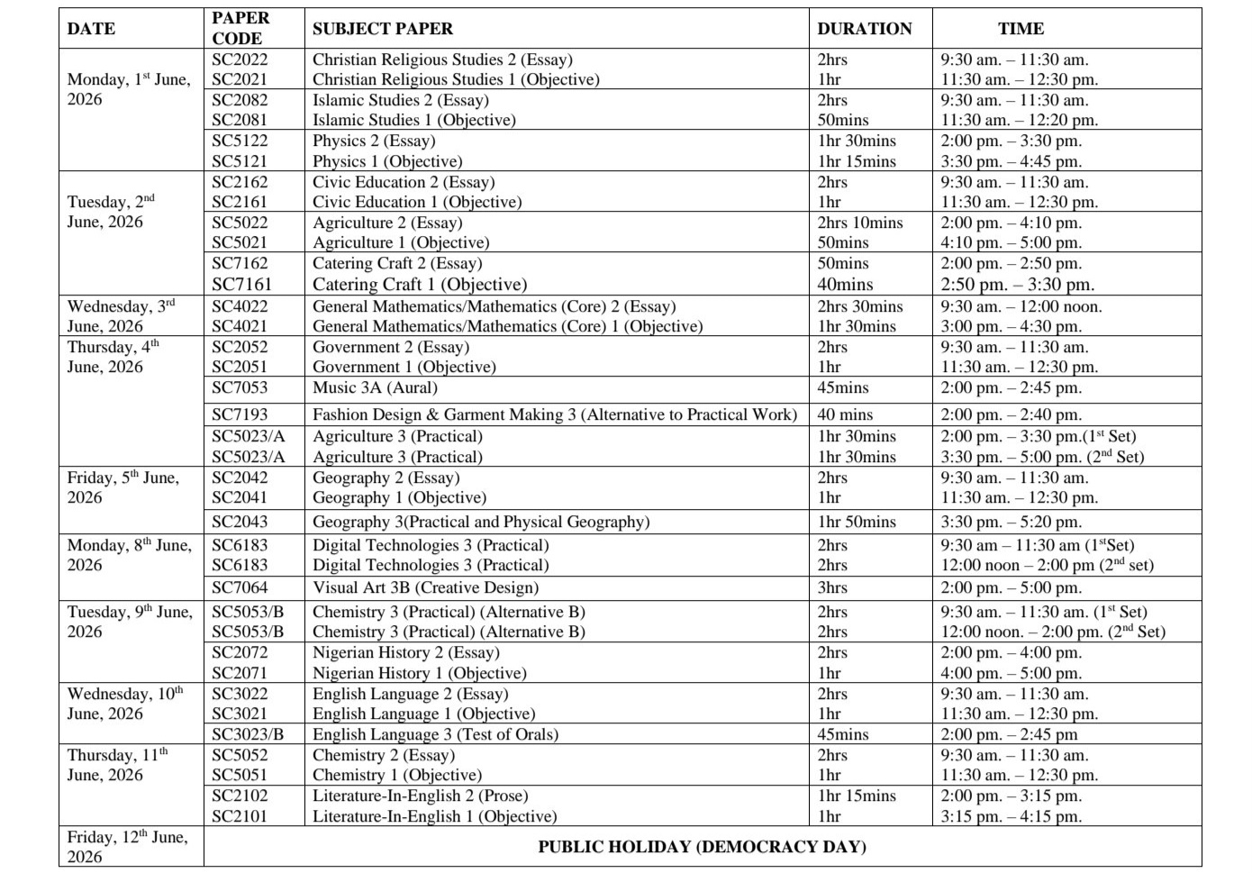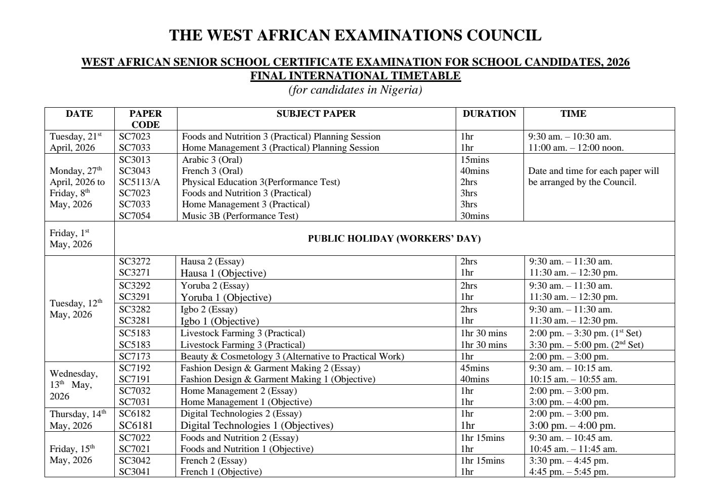 The West African Examinations Council (WAEC) has released the 2026 WASSCE Provisional International Timetable for School Candidates dated March 26, 2026. Below is the timetable typed out in a clean, easy-to-read format.